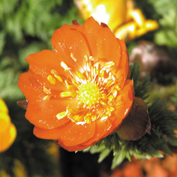 It turned out to be a flower which was special for New Year. Pheasant's eye, fukujusō, New Year's Day Plant. It grows in many mountainous areas of Japan. It begins to show new leaves in February or March and flowers with small bright yellow blossoms of 10 to 20 petals with a strong glow. Since the flowering time fell in the New Year season according to the lunar calendar, it was used as a decoration for the New Year, and so it came known as Pheasant's Eye or New Year's Day plant. Even now some farmers grow it especially to flower for the First of January.